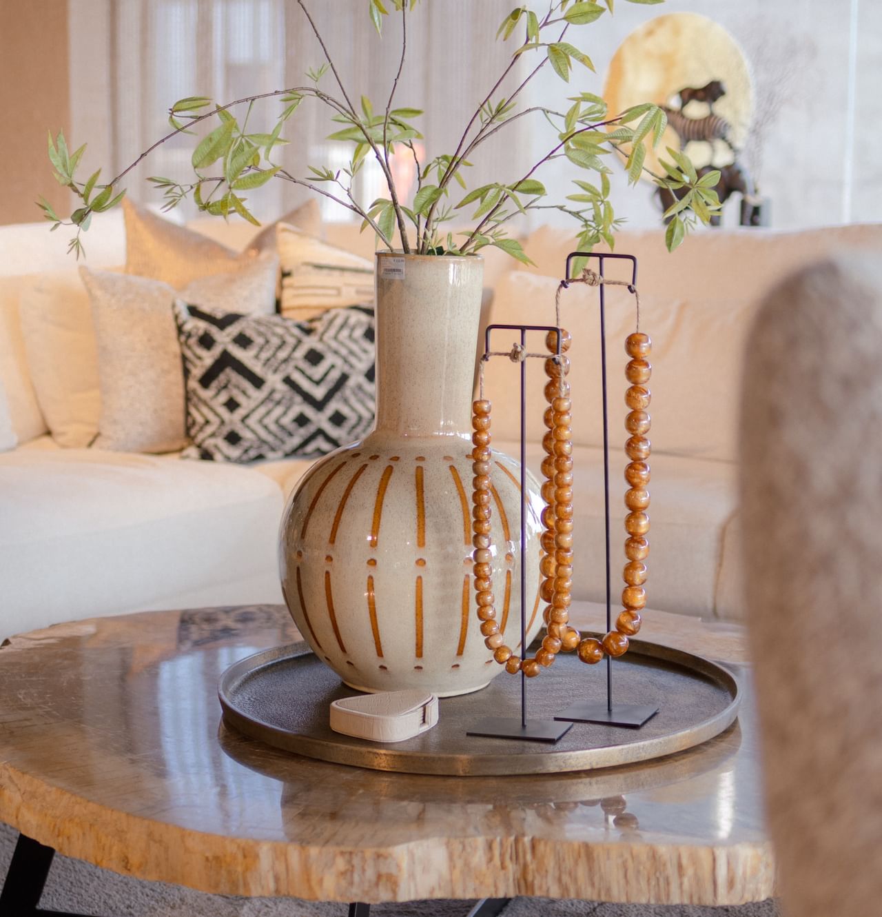 Auch natürliche Materialien bleiben weiterhin ein zentrales Thema. Holz, Muscheln, Leinen und Stein holen die Natur ins Haus und schaffen eine warme, organische Wohnlichkeit. Denk zum Beispiel an Vasen mit Muschelstruktur, die einen dezenten, tropischen Akzent setzen, oder Windlichter aus Alabaster, die mit ihrem weichen Licht eine natürliche Eleganz ausstrahlen.