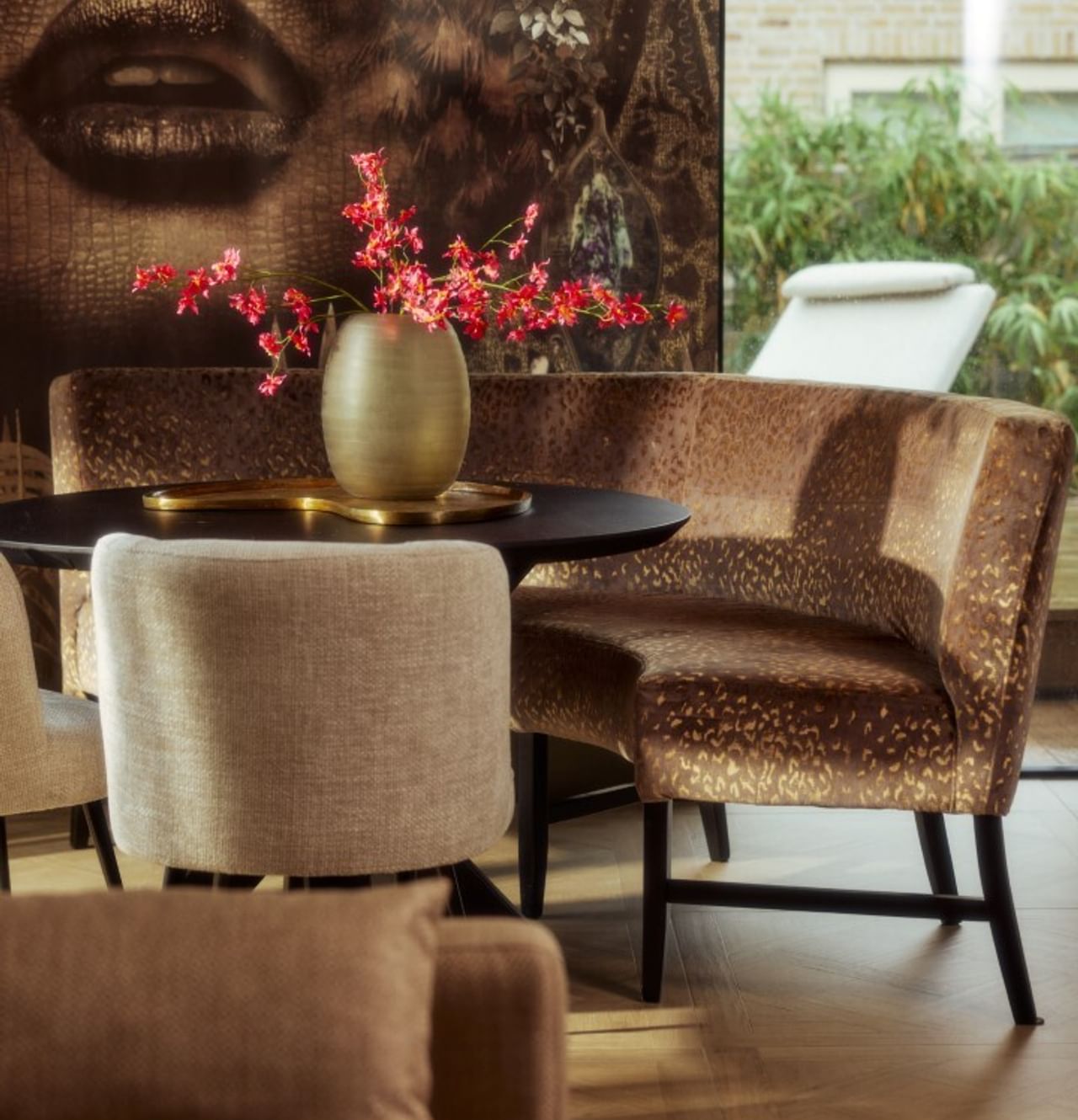 Die organischen Formen sind beispielsweise in der runden Bank an unserem Esstisch zu sehen, aber auch in den Stoffen mit Druck auf unseren Sesseln. Den organischen Teppich habe ich selbst entworfen und von Joost und Bas anfertigen lassen. Ich liebe auch Holz sehr. Unser Fernseher steht auf einem einzigartigen Holzmöbelstück aus Indonesien. Es ist ein Baumstamm und sieht aus wie Kunst. Mein Lieblingsplatz? Das wunderbare Sofa, um unsere wunderschöne Aussicht zu genießen.