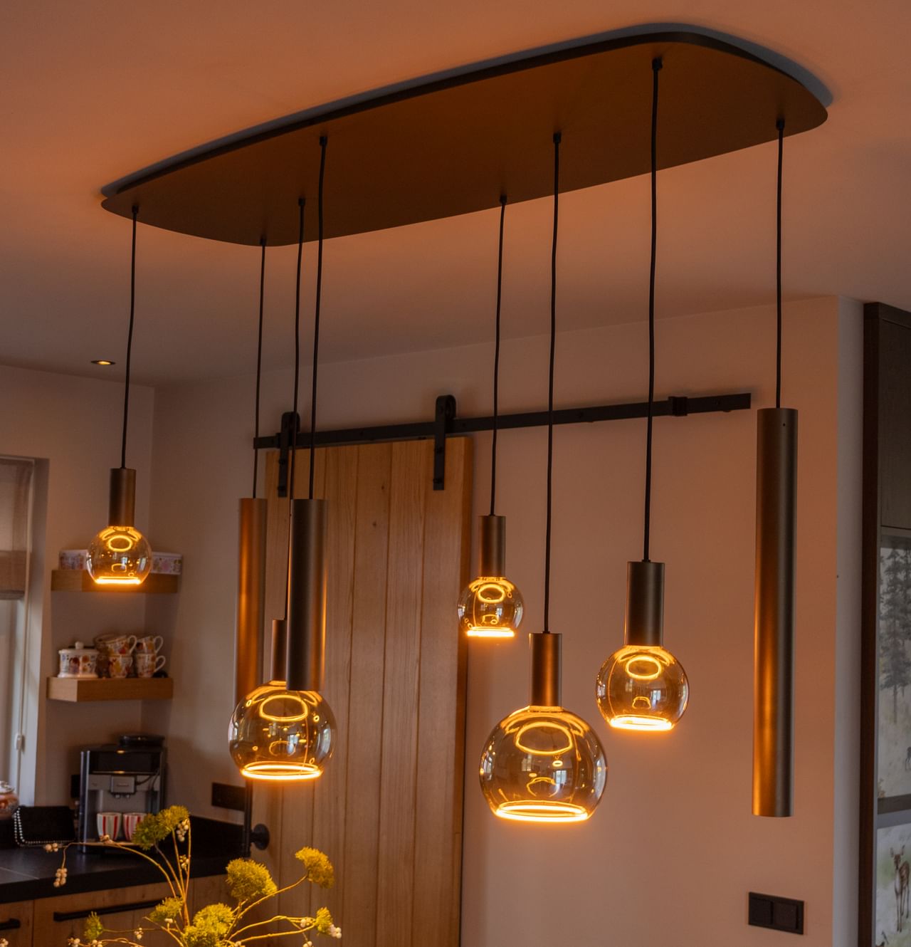 Über dem Esstisch hängen die Riva-Leuchten, die sofort Wärme und Stimmung in den Raum bringen. Tagsüber spenden sie helles Licht, abends schaffen sie eine gemütliche, einladende Atmosphäre. Da die Leuchten perfekt auf den Tisch und den Raum abgestimmt sind, wirkt der Essbereich stets angenehm und wird zu einem Ort, an dem Sie gerne verweilen – selbst nach dem Abendessen.